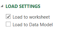 If you pick Load to worksheet, Power Query will load the selected data into an Excel table, selecting the Load to Data Model option will load the data into the workbook’s Power Pivot.