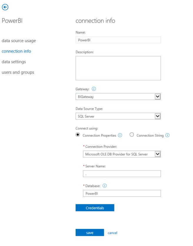 Note that in my case Credentials Type says “Loading…”, my guess it’s because the Gateway app is running on a different machine, unfortunately I am not writing this post on the machine that is running the gateway app, on that machine, however, this screen give me an option to either provide windows or SQL credentials type and then specify login and password