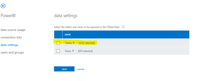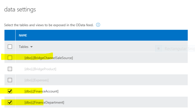 After that you can click on data settings and select tables and views that you would like to expose through OData to your end users