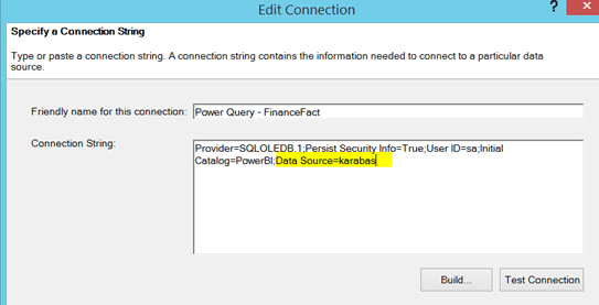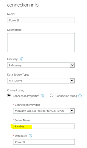 Note that I am using the same host name both in Data source connection set up and Power Pivot connection information. Obviously, anyone inside Microsoft data center would not be able to ping my host server – Karabas, but that’s where the Gateway comes to rescue. As long as the host name in the Power Pivot connection is the same as the one defined in the Power BI Admin Center, the data refresh will work.