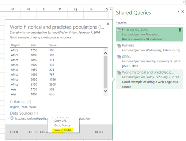 Please see a sample list of Shared Power Queries above. The interesting idiosyncrasy is that there is no way to delete a query from this list. The only option that we have is to see the Analytics information about the selected query