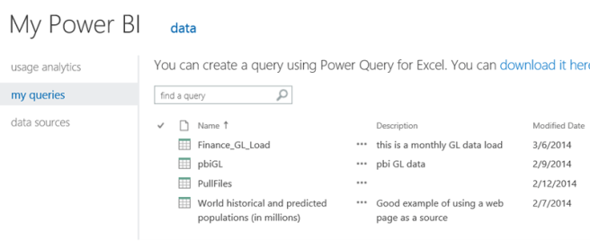 This option will take you to a Power BI Data catalog portal that will list things like Usage Analytics, My Queries and Data Sources