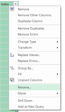 - Now we are ready to add an ID field. Click on Add Column->Add Index Column->From 1 to add a new column with incremental values starting from 1