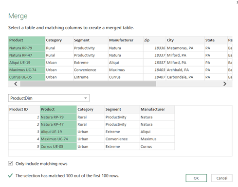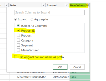 Now we can Expand the new column that was created as a result of the Merge operation and pick Product ID from the list (note that we unchecked the default column prefix to save us from having to rename this column later on to get rid of the prefix)