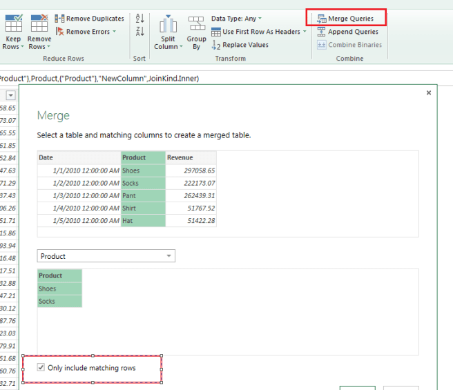 - Select “Only include matching rows” and select OK. This will merge Sales data with the Products and selects only those rows that are matching. Hence we are filtering Sales table to include only rows that have Shoes and Socks as Products