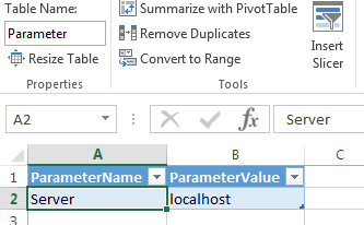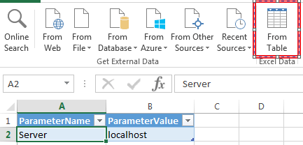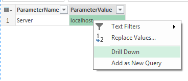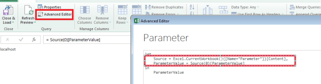 ParameterSource = Excel.CurrentWorkbook(){[Name=”Parameter”]}[Content],
