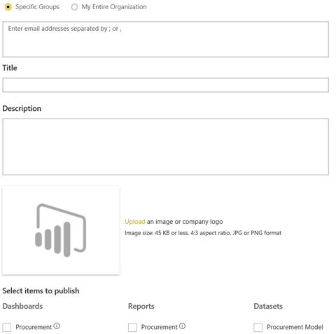 You will then have an option to specify who has access to the content pack, its Title and Description (both are required) and also what dashboards, reports and datasets should be included in it