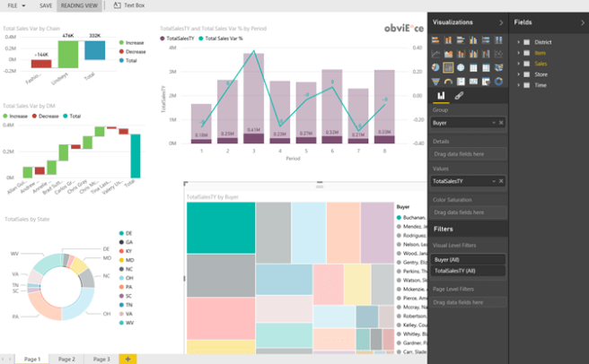 Reports are collections of PAGES. One page consists of a canvas that is used to view/edit charts and a Filter (in View mode) or Visualizations / Fields panes (in Edit mode). Reports are interactive – when you click on different elements of a chart, the rest of the report will update to reflect the relative contribution of the element that has been selected (or filtered on)