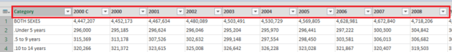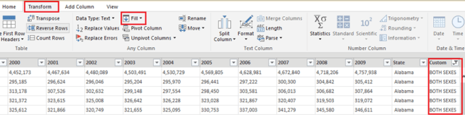 - Notice that in the file there is data for BOTH SEXES, MALE and FEMALE. We want just BOTH SEXES. To achieve this, add a Custom column