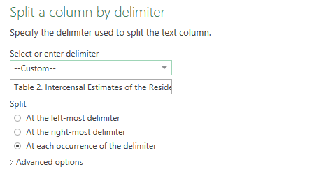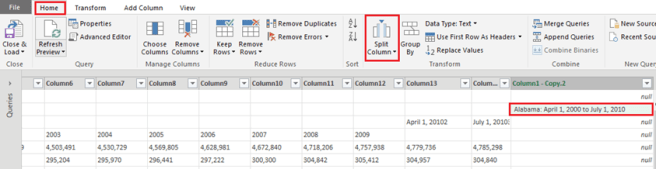 - Select the cell that has the state name. From the ribbon select Home -> Split Column -> By Delimiter