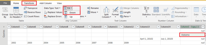 - Highlight the Custom column, from the filter select Transform -> Fill -> Down