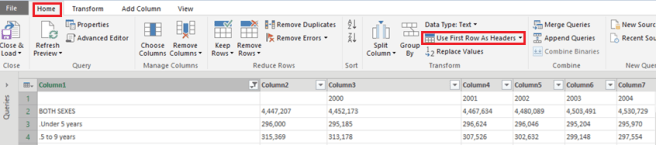 - From the ribbon, click on Home -> Use First Row As Headers”