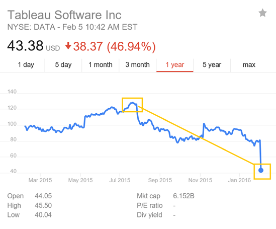 Correlation <> causation, as we all know, but it’s kind of interesting how both precipitous drops in Tableau’s stock value coincided with Power BI going GA last year and then with this week’s big announcement from Microsoft about the release of the Publish to Web functionality. According to most articles that I have read on this subject, the analysts say that the drop in price did not occur due to underwhelming financial performance (although there was some of that) but rather due to concerns about long term viability of the company.