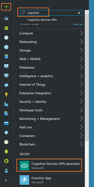 In Azure Portal, click on the “+”, type in “Cognitive” in the search box and then click on Cognitive Services API (Preview) below
