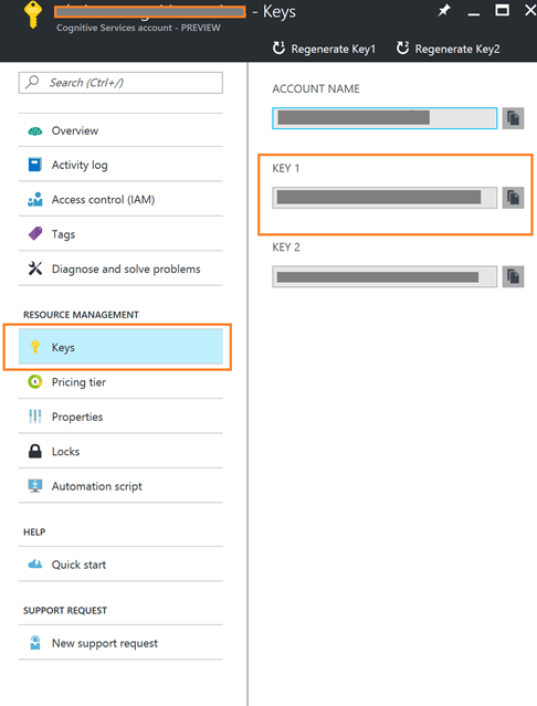After this, resource is created, you can open it up, go to Keys and grab one of the two keys there (as in copy it to your clipboard)