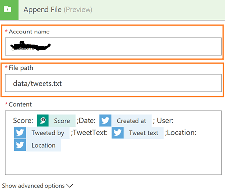 As you can see in the image below, there are only three fields that need to be populated for the Data Lake Append File action to run:
