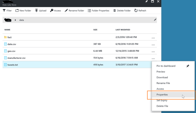 In order to configure those two fields, you need to first go to http://portal.azure.com and find the Data Lake Store that contains your file. The name of this Data Lake Store is the Account Name. After you open up your Data Lake Store, navigate to the folder that contains the file that you will be writing into. Then, click on the three dots to the right of the file name, and then click Properties.