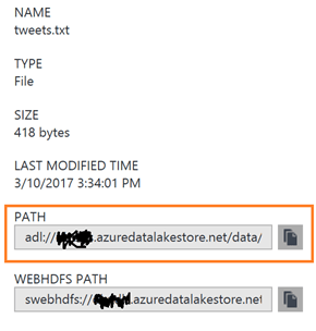 The value in this field will look something like this: adl://YOURADLSNAME.azuredatalakestore.net/data/tweets.txt