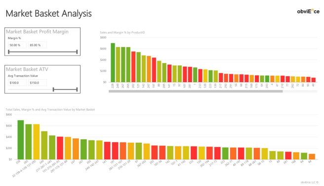 You can play with the slicers to zero-in on market baskets with specific profitability and Average Transaction Value and then explore which products are part of it… The trick question is this – How can you enhance the dataset and the model so that we can start analyzing which products are good candidates to be sold on promotion because they pull through very profitable Market Baskets?