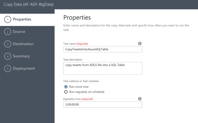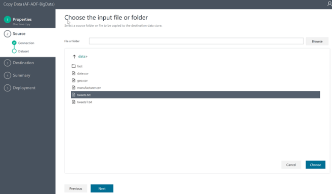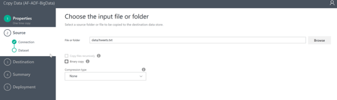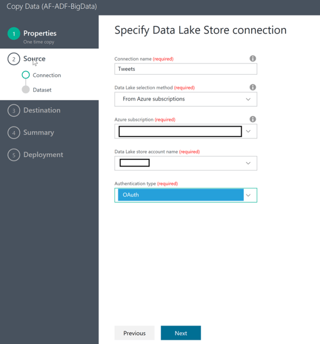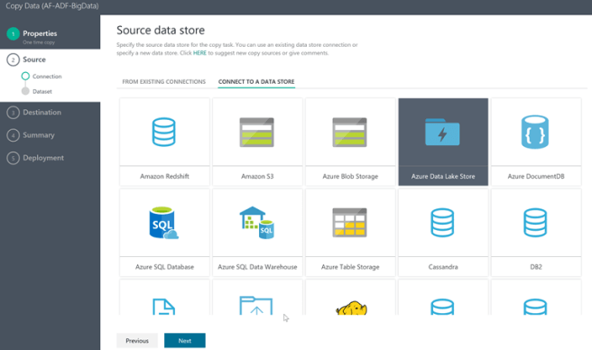 In Step 2 you are required to select the source of the data being moved (in our case Azure Data Lake Store)