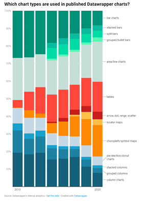 In this chart, Datawrapper has analyzed changes in distribution of chart styles selected by its users… The first thing you will notice is a dramatic drop in usage of column and bar charts that is offset by an increase in usage of tables and choropleths/symbol maps. Also, I found it interesting that scatter plots were barely used.