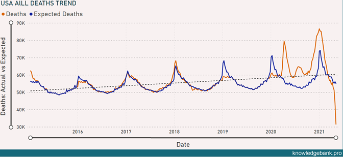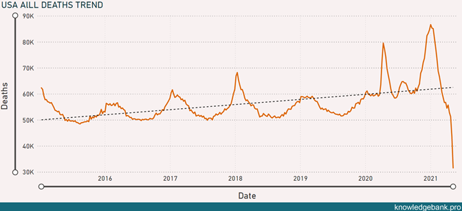 As you can see in the picture below, US deaths tend peak out in January and then then bottom out by mid-summer. This variability in values is called seasonality. You will also notice that on average we see a up trend in deaths – as the population grows so do the deaths.