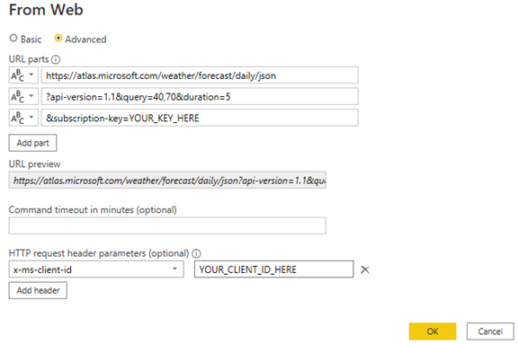 = Json.Document(Web.Contents(“https://atlas.microsoft.com/weather/forecast/daily/json” & “?api-version=1.1&query=“&Lat&”,”&Long&”&duration=5″ & “&subscription-key= YOUR_SUBSCRIPTION_KEY_HERE“, [Headers=[#”x-ms-client-id”=”YOUR_CLIENT_ID_HERE“]]))